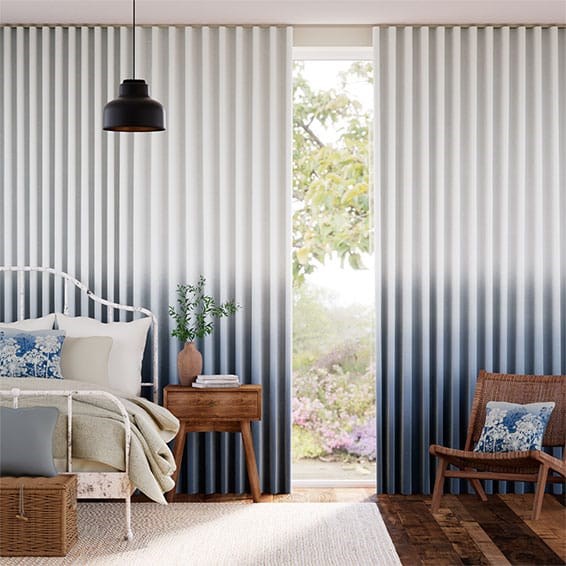 Ombre è il design caratteristico firmato Clarissa Hulse. La gradazione parte dal blu diventando sempre più chiara e luminosa. Estremamente rilassante, per questo la tenda Ombre Mezzanotte è perfetta in camera da letto.