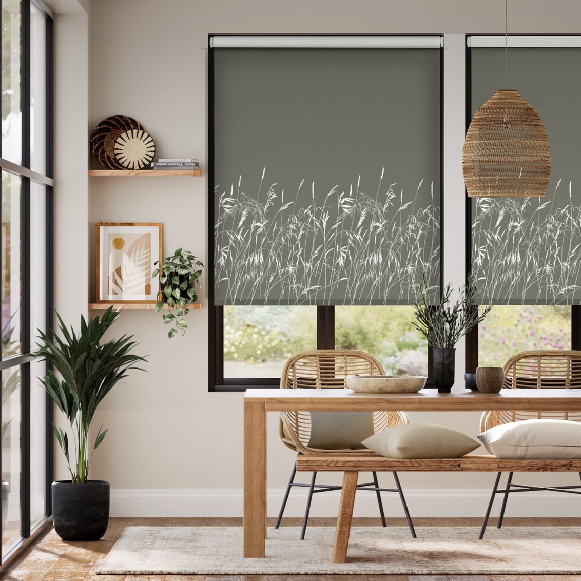 Campagna Silhouette Dark danzano mossi dal vento, su uno sfondo a contrasto grigio intenso. La tenda a rullo Campagna Silhouette Dark è perfetta se combinata ad un arredamento moderno. Sublime se abbinata al bianco.